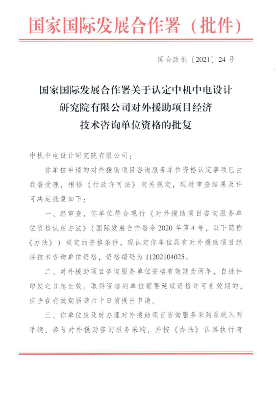 中機中電設(shè)計研究院對外援助項目經(jīng)濟(jì)技術(shù)咨詢單位資格